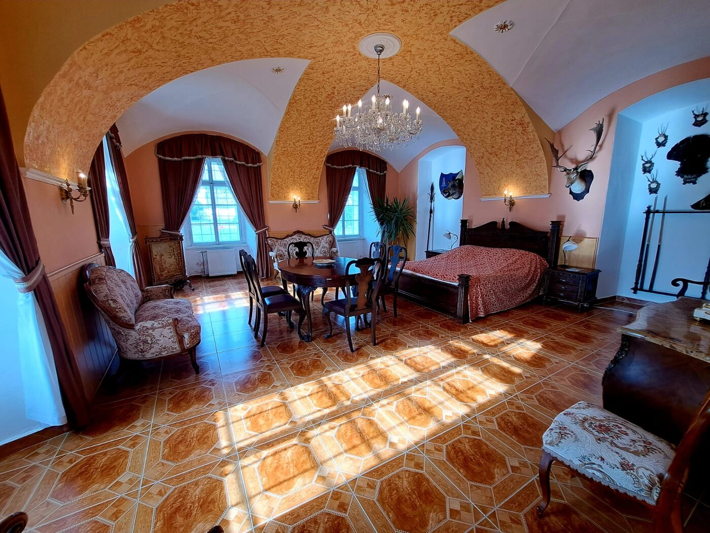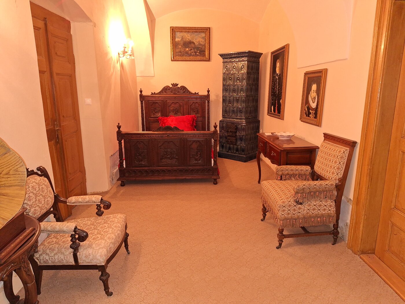 Ubytování - nabízíme tři zámecké komnaty s dvoulůžky. Nejedná se o hotelové pokoje, ale zámeckou expozici s historickým mobiliářem, takže se budete cítit jako šlechta. Fotky pokojů naleznete pod textem.